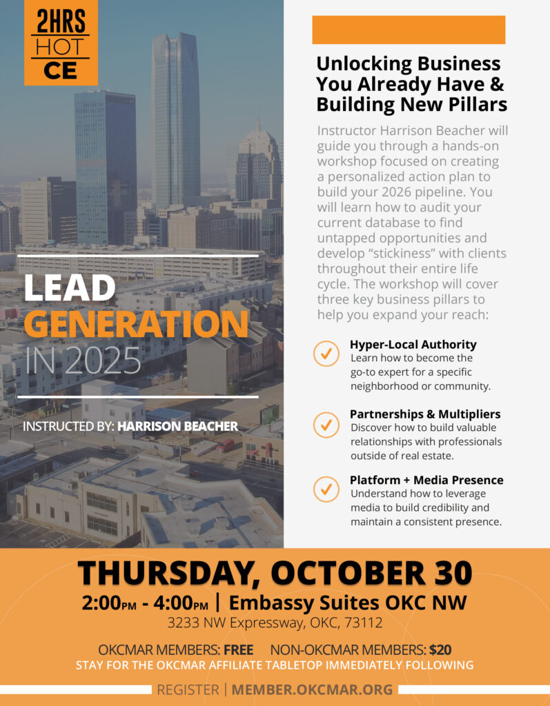 In “Lead Generation in 2025: Unlocking Business You Already Have + Building New Pillars,” instructor Harrison Beacher will guide you through a hands-on workshop focused on creating a personalized action plan to build your 2026 pipelineYou’ll learn how to audit your current database to find untapped opportunities and develop “stickiness” with clients throughout their entire life cycle. The workshop will cover three key business pillars to help you expand your reach:
